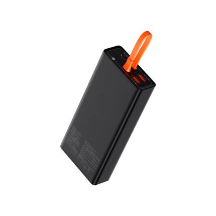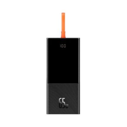 Baseus 65W Elf Power Bank- 20000mAh. Baseus Elf 65W USB-C Power Bank is a 20,000mAh capacity battery pack with a built-in Type-C cable supporting up to 65W input-output to fast charge your devices and recharge the power bank in a short time. The 3 ports and built-in cable allow fast charge 4 devices simultaneously.