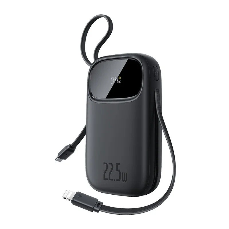 Integrated Dual Cables: Features a built-in USB-C cable and a Lightning cable, reducing clutter.