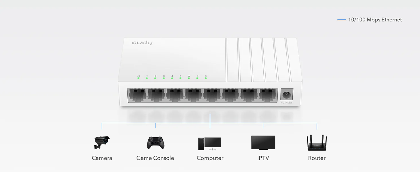 The Cudy FS108D is an unmanaged 8-port Ethernet switch that provides reliable 10/100Mbps wired network connectivity for homes, offices, and small businesses.