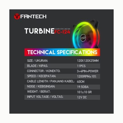 Fantech FC124 Turbine RGB Dual Side Illuminated Casing Fan comes with automatic changing RGB lights. It is featured with 120 mm size raduis fan, 1200RMP speed, Silent type fan 19.5dBA and Anti Vibration. In this Casing Fan, 9 pcs Blade are available. This Dual Side Illuminated Casing Fan comes with Plastic Radiator Material, Connector 3 + 4pin, 50cm length cable, 12v DC Input Voltage. The new Fantech FC124 Turbine RGB Casing Fan has 01 year warranty.