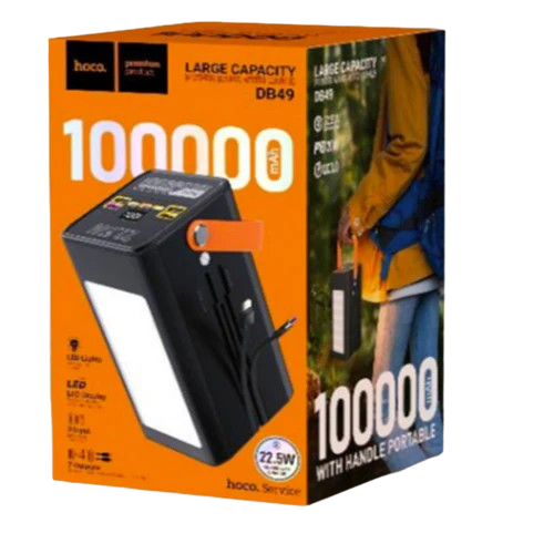 - The Hoco DB49 22.5W 100000mAh power bank is a true powerhouse designed for users who need long-lasting backup power for travel, outdoor work, or emergency use. With its massive 100000mAh capacity (370Wh), it keeps your devices running for days without needing to recharge the power bank itself. Whether you’re charging smartphones, tablets, or small electronic gadgets, this device offers reliable and consistent performance.