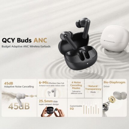 QCY Buds ANC HT15 45dB Adaptive ANC Wireless Earbuds. Premium Design with Leather Texture · Cutting-edge Active Noise Cancellation (ANC) · Superior Sound Quality with Deep Bass · Comfortable Fit for All-Day Use.