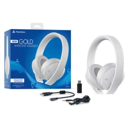 Sony PS4 Gold Wireless Headset White. Designed to be worn comfortably during long gaming sessions and with the PS VR headset, the Sony PlayStation Gold Wireless Headset delivers depth and audio clarity, which elevates your gaming experience with customizable game modes created by developers for PlayStation consoles and personal computers. High-fidelity, 7.1-channel virtual surround sound provides an immersive experience into the urban jungles and alien worlds you explore, while the hidden noise-canceling microphones allow you to connect with your friends and teammates. When you’re on the move, use your headset with your mobile device via the included 3.5mm audio cable.